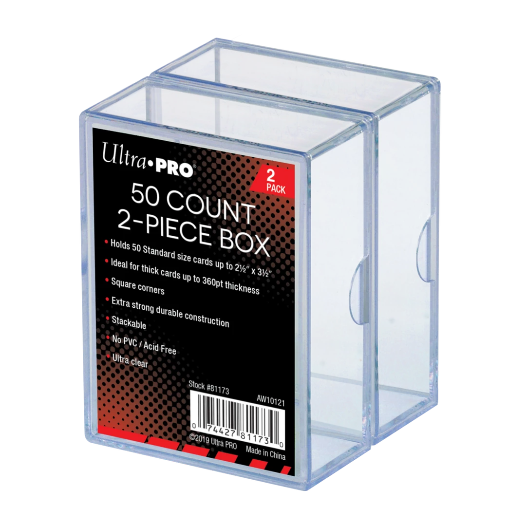 Ultra-clear, heavy-duty boxes have snug fitting semi air-tight closures. This 2-piece box holds up to 50 Standard Size cards. Square corners to help prevent damage to card corners. Stackable for easy organization and storage. 2 boxes per pack.
