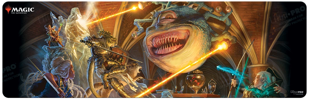 Ultra PRO’s Adventures in the Forgotten Realms – The Party Fighting Xanathar 8ft Table Playmat- for Magic: The Gathering provide a soft fabric play surface which helps protect cards during gameplay. The non-slip rubber backing helps keep the Table Playmat from shifting during use. Measures approximately 90 in. x 30 in.