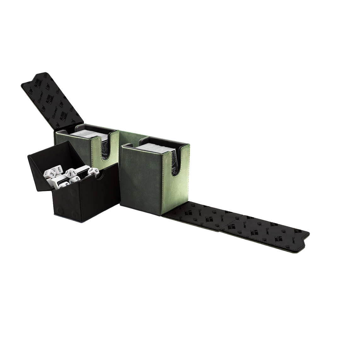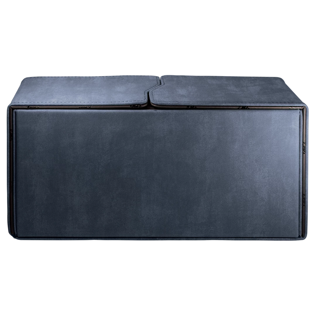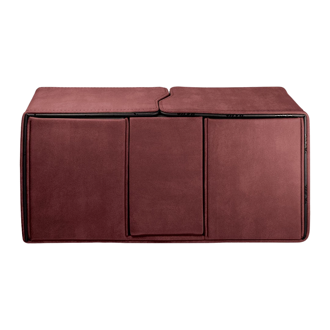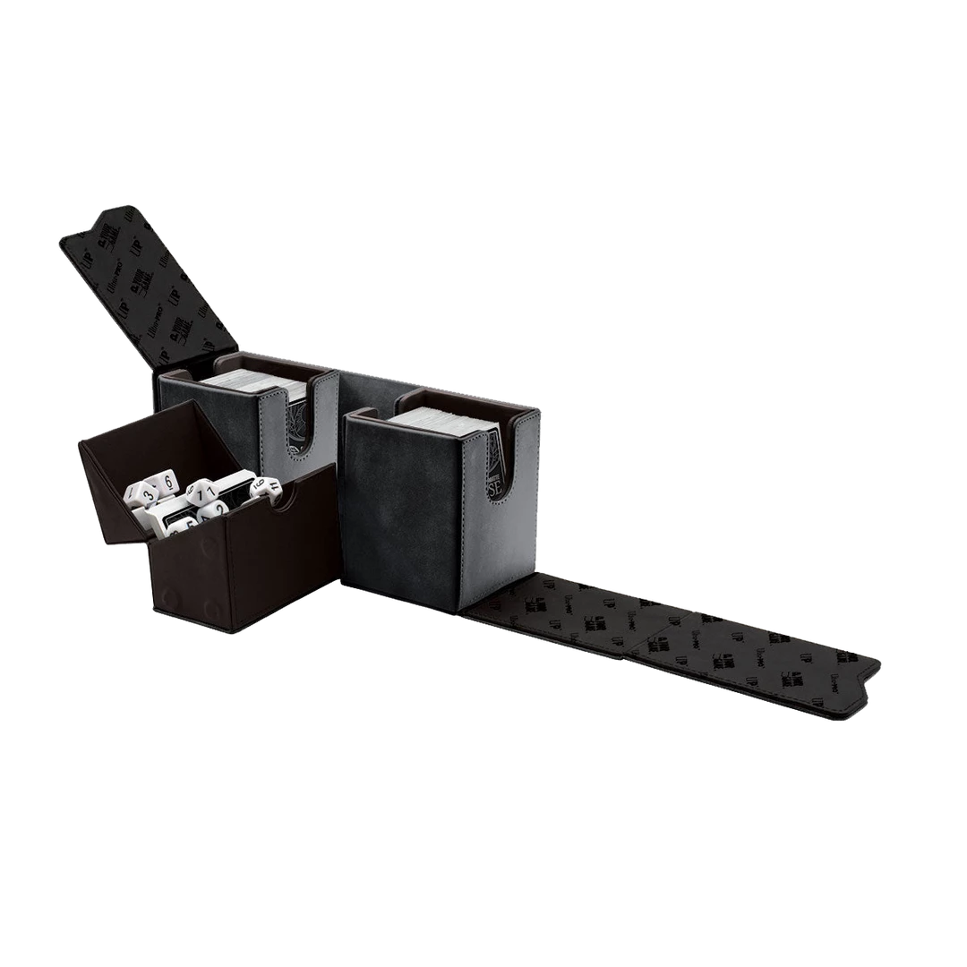 Bring your most powerful decks to the next game night with the Suede Collection Alcove Vault Deck Box! The Alcove Vault’s heavy-duty construction stores and protects up to three separate decks of cards in Deck Protector sleeves. Two compartments to the left and right of the Alcove Vault can each hold up to 100 sleeved standard sized (2.5″ x 3.5″) trading card game cards and feature easy-to-access finger notches to easily remove your decks. The center compartment can hold an additional deck or store dice, tokens, counters, and other small gaming accessories. The Alcove Vault’s lids are held secure by powerful magnets and the entire body is wrapped in premium leatherette material. The Suede line is available in Sapphire Blue, Ruby Red, and Jet Black.